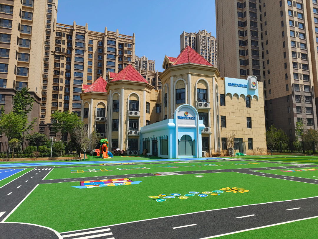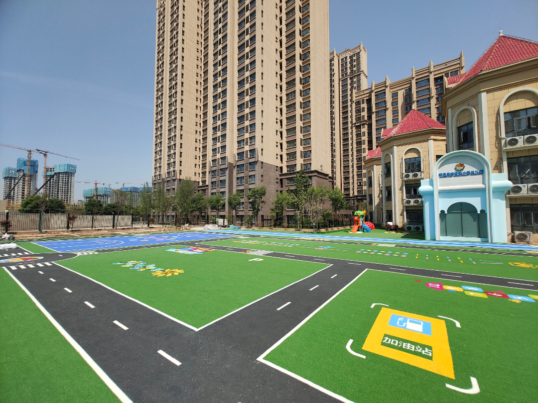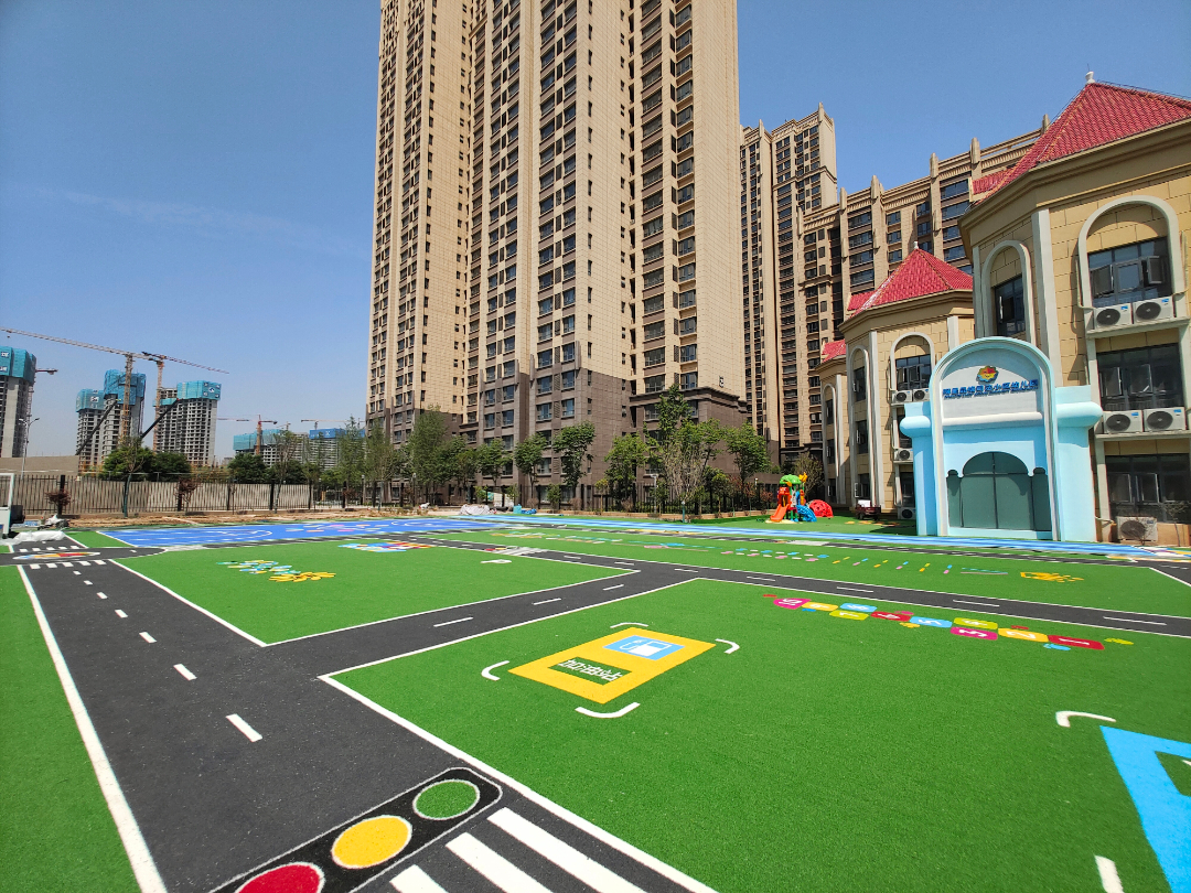 一園一定制,一園一特色,多利隆專門為獅呈品格幼兒園定制了一些體適能圖案,公路斑馬線、紅綠燈的設(shè)計,能夠很好的幫助幼兒適應(yīng)社會環(huán)境,與學(xué)校辦學(xué)理念“在游戲中學(xué)習(xí)知識”高度契合,幫助幼兒提高環(huán)境感知能力。