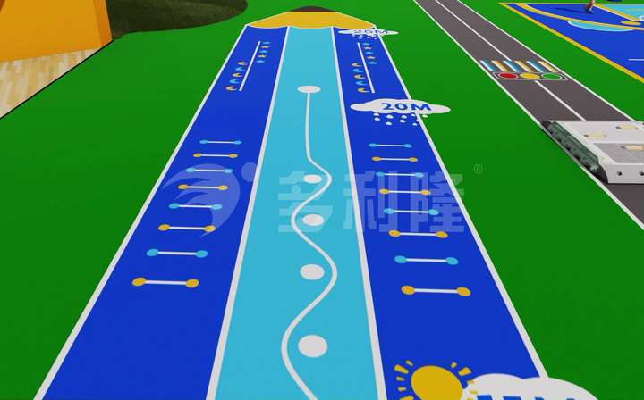 像這條跑道,以小熊鉛筆為靈感,將經(jīng)典體適能圖案融入其中。孩子們?cè)诘貜椘号艿郎峡梢宰杂杀寂埽M(jìn)行各種單項(xiàng)體能訓(xùn)練,以及開展各類競(jìng)技比賽。