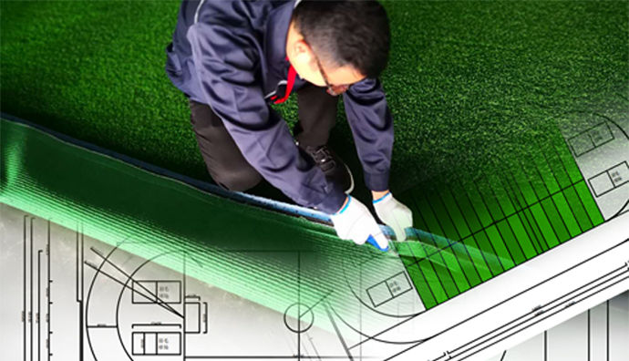 如有圖案施工,需按照圖案大小在相應(yīng)的安裝位置將原有草坪裁掉,然后用接口帶將圖案粘接在相應(yīng)的位置。裁草坪時應(yīng)嚴(yán)格按照圖案大小進(jìn)行裁切,寧可裁小進(jìn)行修正,避免裁大進(jìn)行修補(bǔ)。