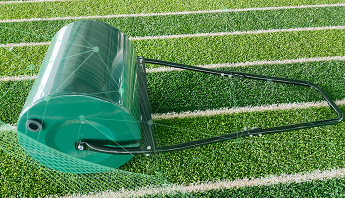 草坪周邊固定,主要粘接草坪橫向的兩個邊緣(橫向指單卷草坪的寬邊,既無需拆黑邊的邊緣),需在草坪背膠和接寬帶均勻涂膠,粘接好后需用壓碾桶滾進(jìn)行重壓,所有草坪粘接完成后,膠水固化需24小時以上。